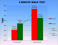 A t-test was done to analyze the within group difference of six-minute walk test which shows that there was a significant improvement for six minute walk test in Group A from pre to post T value (14, 0.05) = -10.088, P<0.000. Group B also showed a significant improvement from pre to post for six-minute walk test. T value (14, 0.05) = -6.859, P<0.000. Univariate analysis of variance was done to analyze the between group difference of six-minute walk test and showed a significant difference between groups, F value (1, 27, 0.05) = 45.645, P<0.000.