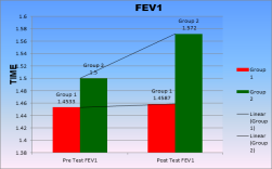 A t-test was done to analyze the within group difference of FEV1 and there was no significant difference for FEV1 in group A from pre to post. T value (14,0.05) = -0.866, P<0.401. But Group B showed a significant difference from pre to post for FEV 1, ‘t’ value (14,0.05) = 6.144, P<0.000. Univariate analysis of variance was done to analyze the between group difference of FEV1 and showed a significant difference between groups, F value (1, 27, 0.05) = 29.25, P<0.000.A t-test was done to analyze the